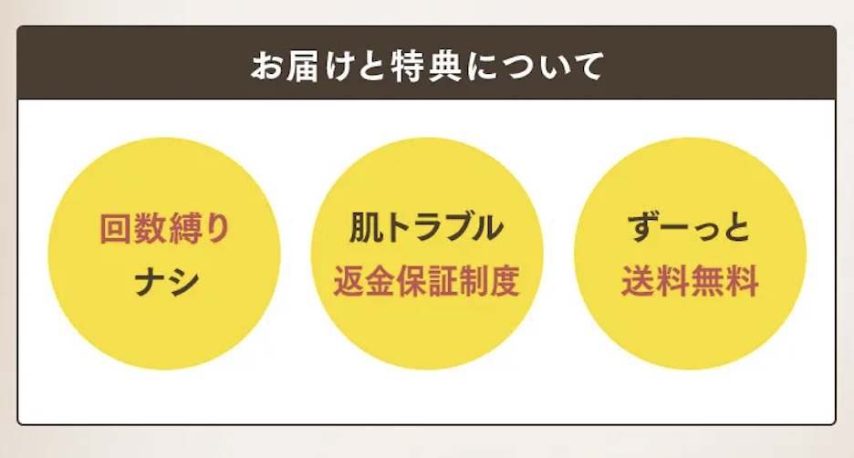 ●安心の特典(回数縛りなし、肌トラブル返金保証制度、送料無料)